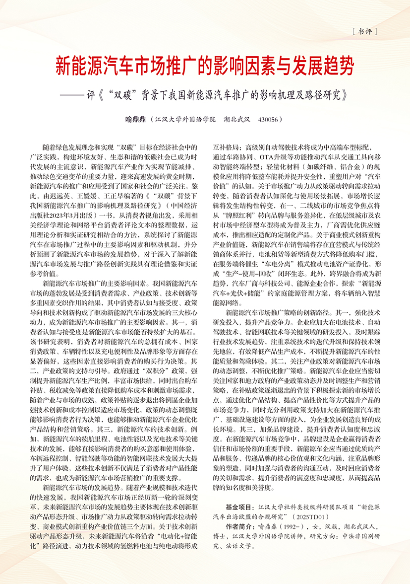 | 新能源汽车市场推广的影响因素与发展趋势 ——评《“双碳”背景下我国新能源汽车推广的影响机理及路径研究》 |