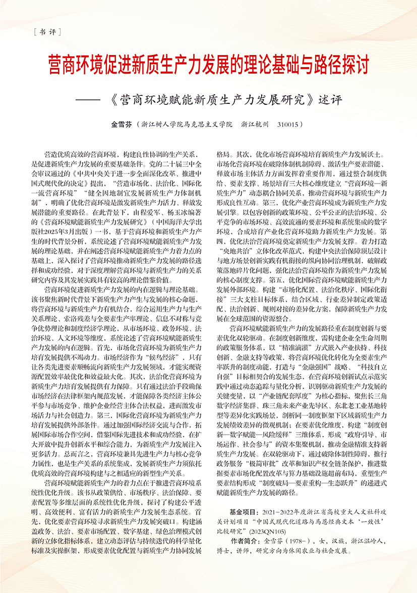| 营商环境促进新质生产力发展的理论基础与路径探讨 ——《营商环境赋能新质生产力发展研究》述评 |