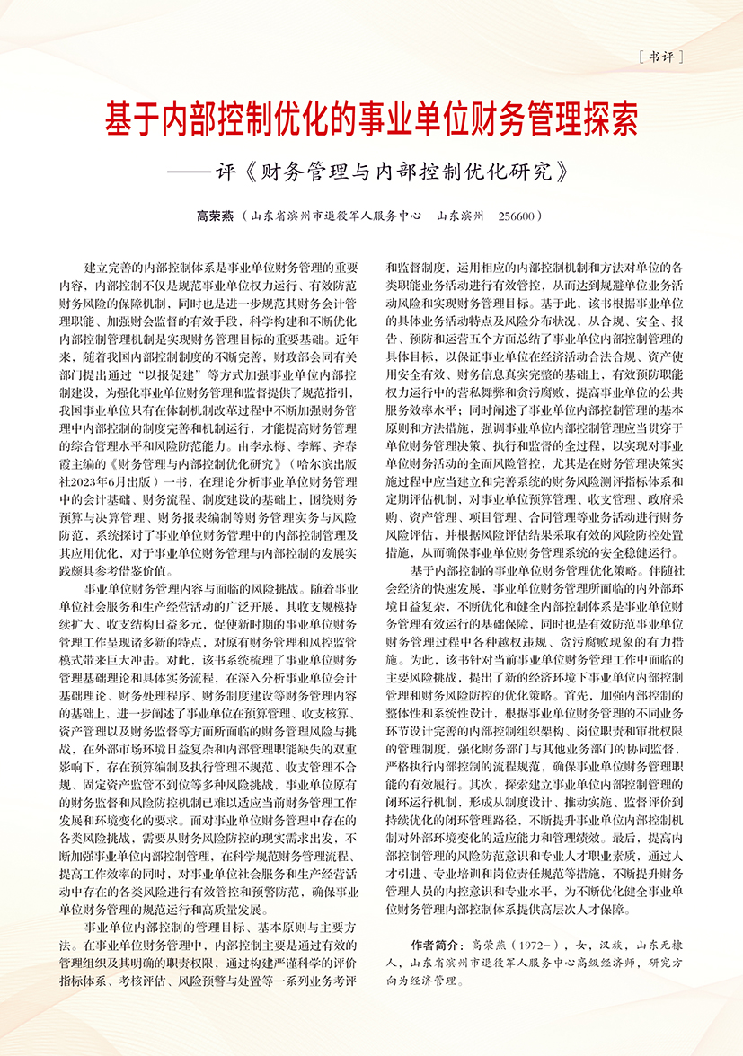 | 基于内部控制优化的事业单位财务管理探索 ——评《财务管理与内部控制优化研究》 |