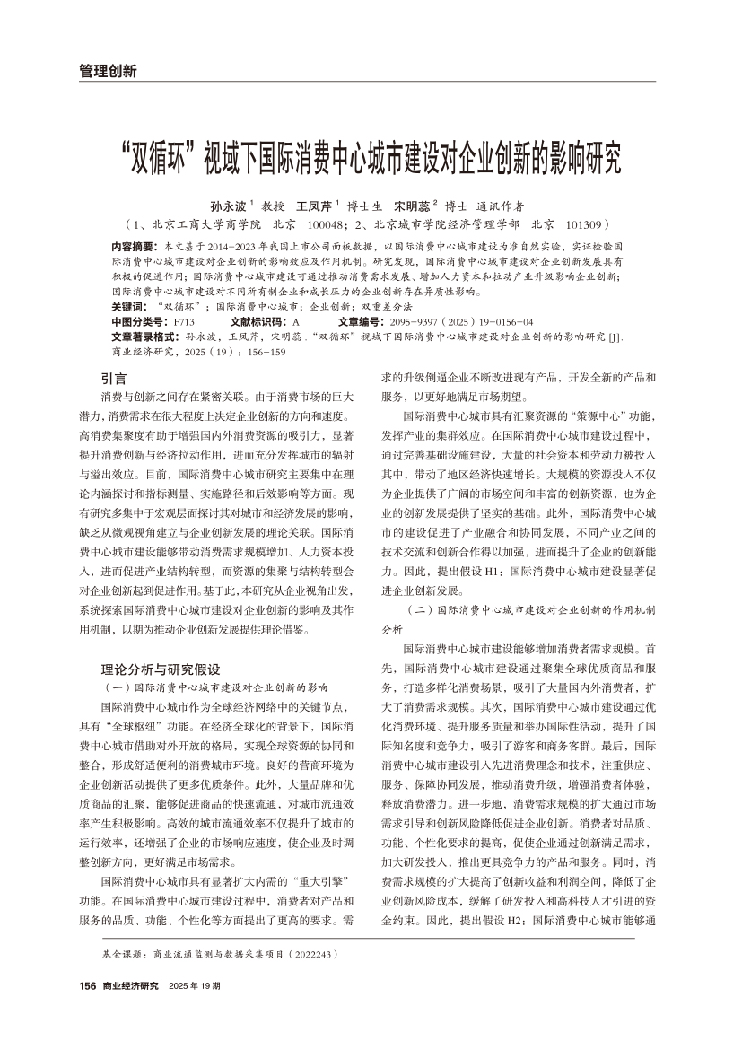 “双循环”视域下国际消费中心城市建设对企业创新的影响研究 |