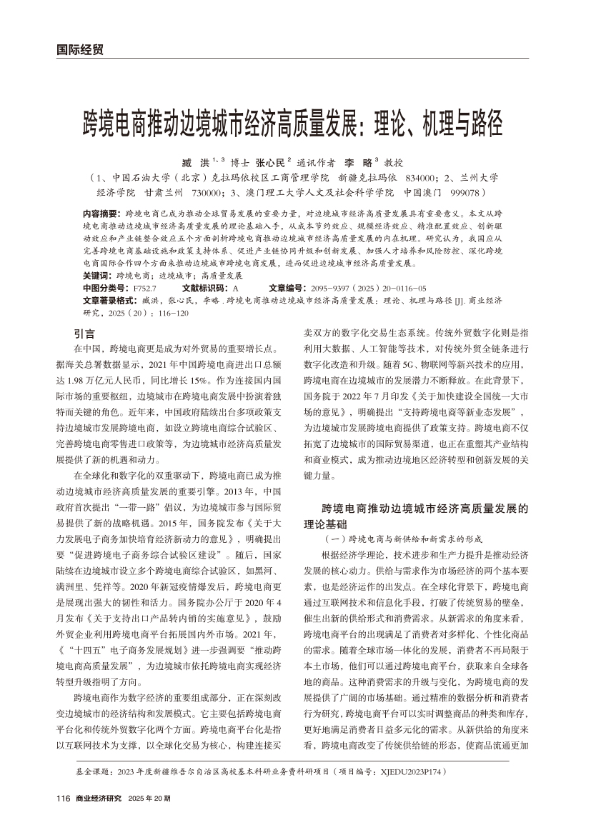 跨境电商推动边境城市经济高质量发展:理论、机理与路径 |